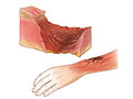 Burns injure the skin layers and can also injure other parts of the body, such as muscles, blood vessels, nerves, lungs, and eyes. Burns are defined as first-, second-, third-, or fourth-degree, depending on how many layers of skin and tissue are burned. The deeper the burn and the larger the burned area, the more serious the burn is.