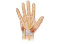 hand and wrist when tendons and the tendon covering (sheath) on the thumb side