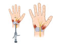 small incision in the wrist (single-portal technique) or at the wrist and palm