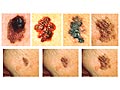 • Seborrheic keratoses. These skin growths are almost always harmless. They are found most often on the chest or back; occasionally on the scalp, face, or neck; and less commonly below the waist. They begin as slightly raised tan spots that develop a crusty appearance like that of a wart. For more information, see the topic Seborrheic Keratosis.