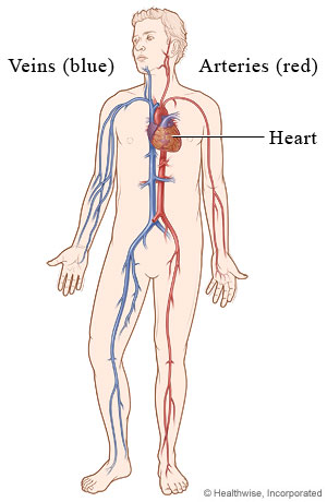 The cardiovascular system consists of the heart and blood vessels. The blood vessels include arteries and veins. The heart pumps blood from the lungs out to the rest of the body. The blood vessels deliver oxygen and nutrients to the tissues and carry waste products to the organs responsible for elimination. The arteries carry blood from the heart to the rest of the body, and the veins carry blood back to the heart.